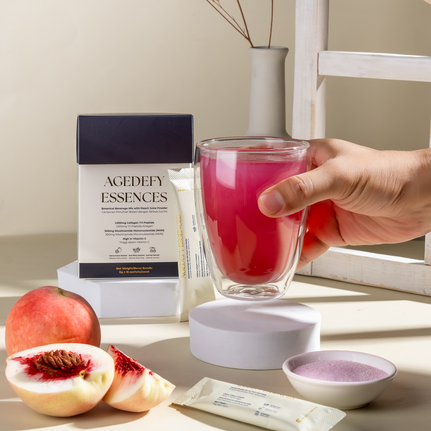 Formulated with NMN, Collagen Tri-Peptide, Vitamin C, Camu Camu, Acai Berry, and Acerola Extract, Agedefy Essences delivers a synergistic blend for cellular vitality, youthful skin, and enhanced immune defense.