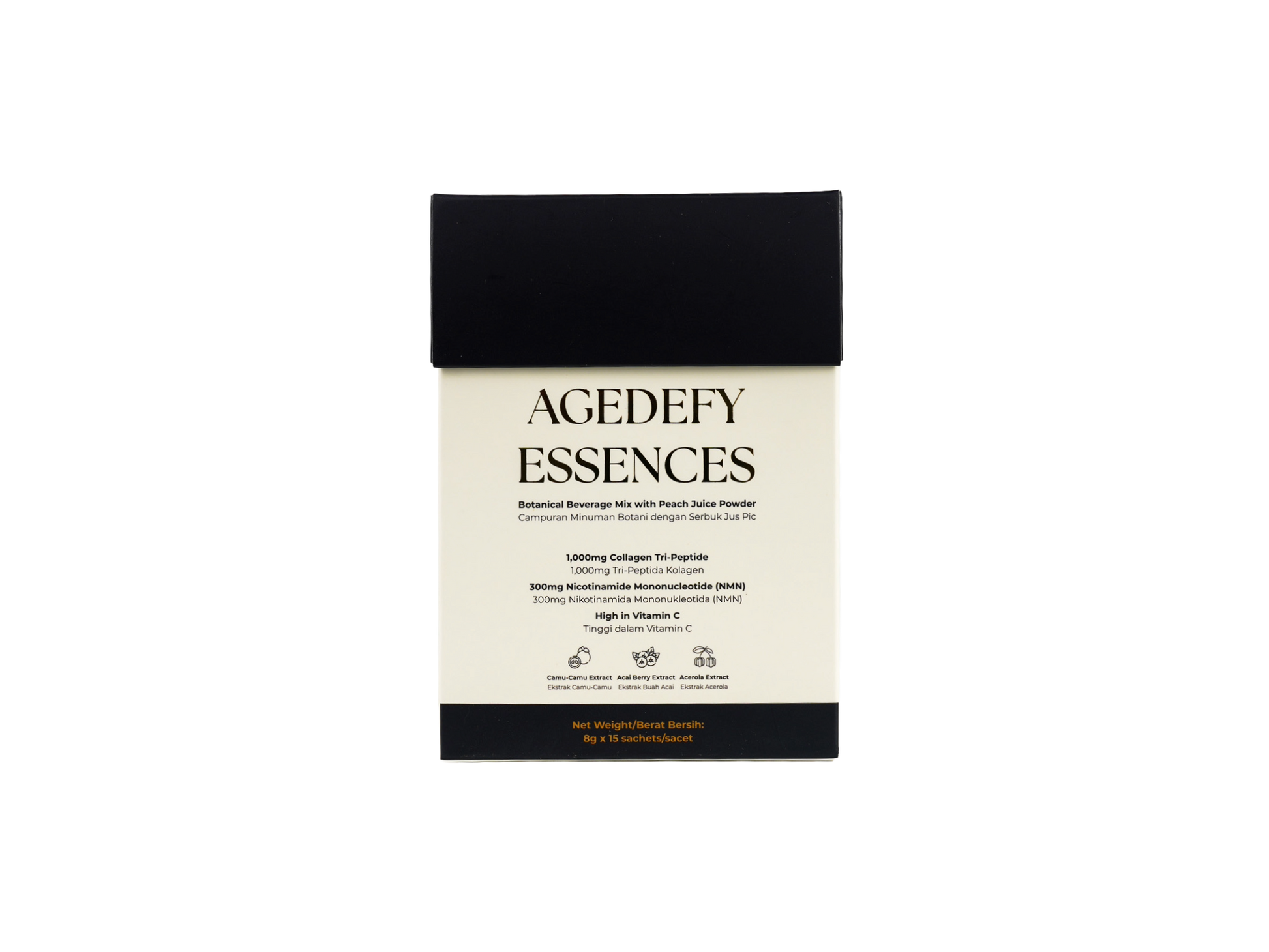 Formulated with NMN, Collagen Tri-Peptide, Vitamin C, Camu Camu, Acai Berry, and Acerola Extract, Agedefy Essences delivers a synergistic blend for cellular vitality, youthful skin, and enhanced immune defense.